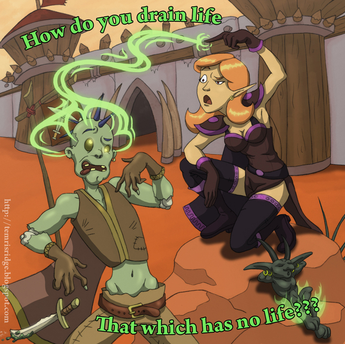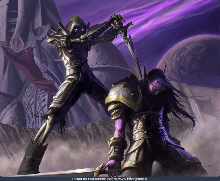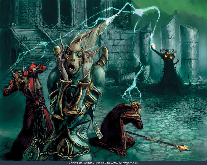 Друид подобрала мачете и подошла к алтарю. Краем глаза она заметила пикирующую тень и шарахнулась в сторону, перекатилась по трупам, окончательно измазавшись в крови. На берег упал и перекатился латник с тяжёлым двуручным мечом…У друидки перехватило дыхание. Аура. Тяжёлая аура Чумы, Нечестивости, вонь мёртвых, запах смерти. Глаза сквозь прорезь шлема сияют чужим холодным белым светом, алмазные искры вечного льда… Рыцарь щёлкнул пальцами, кусок земли рядом с ним мгновенно пропитался скверной, завонял, показались костлявые руки, заскребли, и на поверхность со стоном вылез вурдалак. Жаль, некому сказать «Кайланна, пригнись», и бросить сразу две гранаты. Что ж, ей не впервой умирать. Посох, ко мне…
