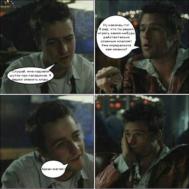 Очень, прямо очень необычный класс. Начиная с того, что близы сами усиленно разгоняли и разгоняют концепцию, что за паладинов играют геи, и заканчивая реальной биполярочкой очень многих паладинов. Латники-рукопашники-лекари. Хорошо танкуют, хорошо лечат. Выживаемость такая, что шутка из Ванилы «Нам не страшен паладин, паладин, паладин, Нас 15 он один, он один, он один!» не шутка. Хорошего паладина хрен убьёшь. Правда, и он хрен кого убьёт, в этом и баланс. В пве палу нормально, только долго мобов ковырять приходиться. Но умный пал это катастрофа. Я на аккаунте друга сделал за Орду паладина, качнул на 20 уровень. Мне трудно было убивать мобов, я туго понимал, как всеми этими печатями пользоваться, какая тут ротация и вообще смысл всего действа. А друг как-то оборонил, что зашёл ночью на этого пала и в соло зачистил Шадоуфанг Кип, только Аругала не смог убить. Нормально. Я простых мобов с трудом добиваю, а он полный данж элиты прошёл.
