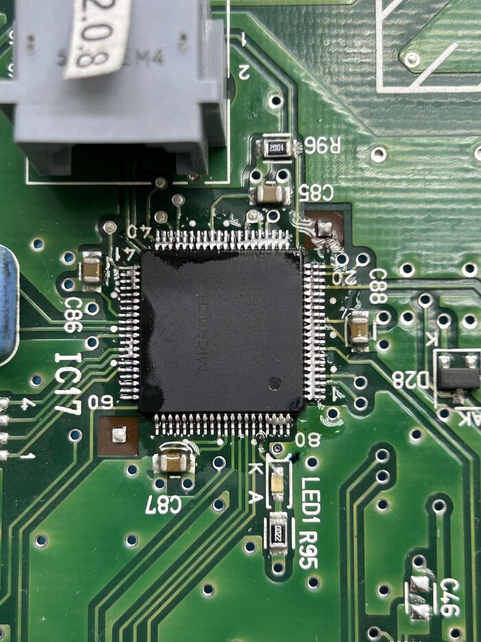 Чтобы не пожечь пластиковые элементы рядом, жирненько проходимся сплавом Розе по выводам микросхемы, чтобы разбавить бессвинцовый припой, плата толстенная, теплоемкая, просто дунуть феном, конечно можно, но плавить корпус для кабеля под RJ45 и доводить текстолит до хрустящей вспученной корки - моветон. Все должно быть красиво.