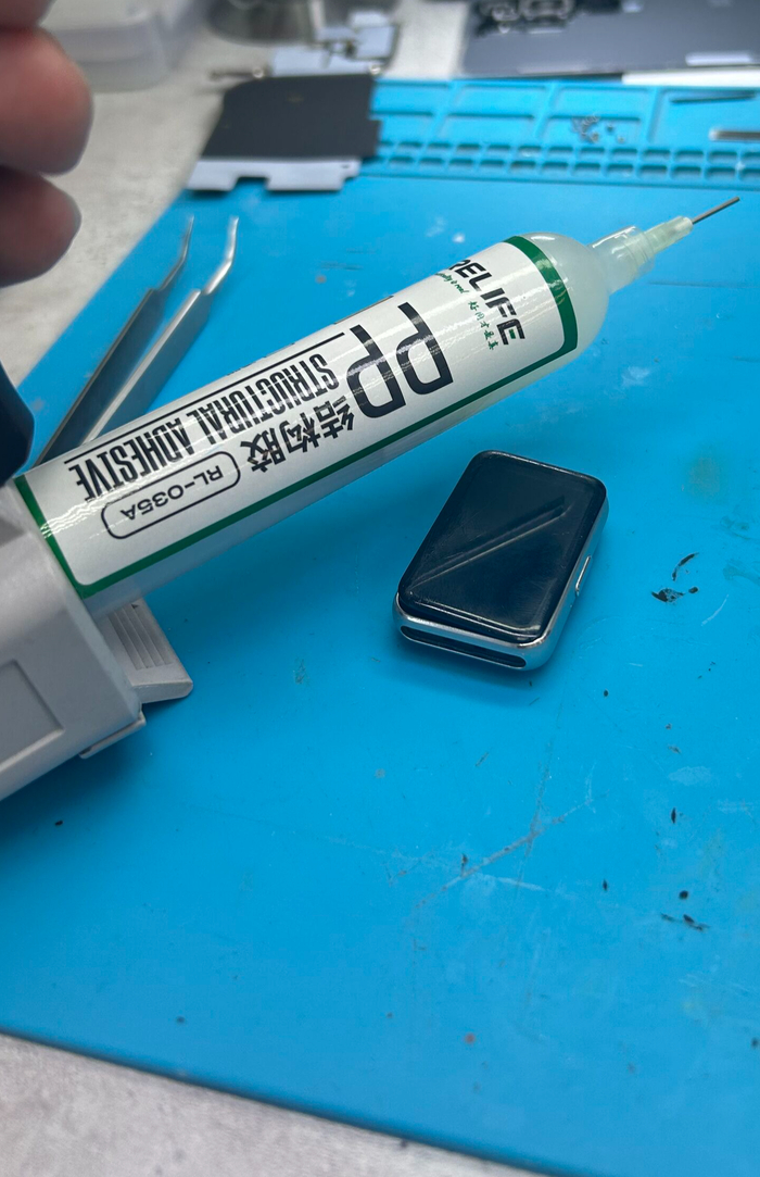 Перед окончательной сборкой обязательно еще раз проверяем наличие картинки и работу сенсора, сенсорных кнопочек под экраном и заряжаем пистолет с полиуретановым клеем.