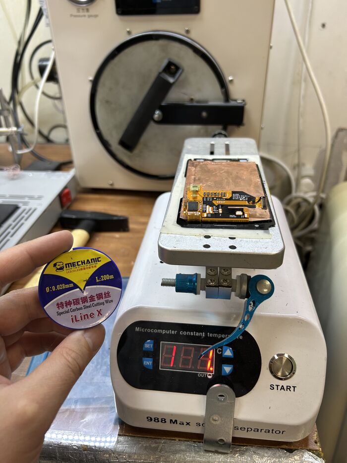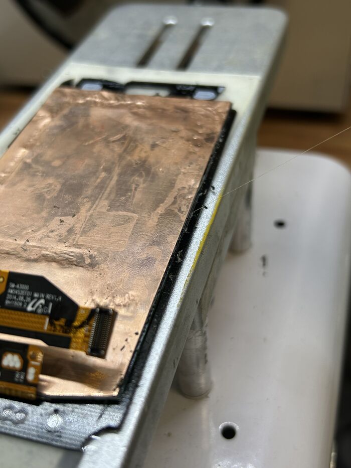 Внешний контур стекла отклеивается легко, греем, льем побольше спирта, добираемся до углов матрицы. А дальше начинается самое интересное. Оставить медную пластину на дисплее, срезать скотч и не хрустнуть матрицу.