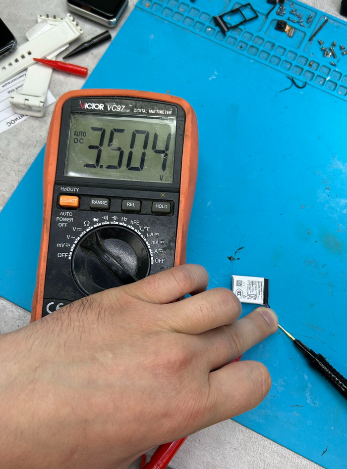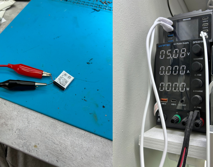 Замеряем напряжение на батарейке и пытаемся ее зарядить автономно лабораторным источником питания. Напряжение на батарейке присутствует, но для старта может быть маловато, при паспортном напряжении 3.87v, а еще вот незадача заряжаться через контроллер она отказывается. Кратковременная вспышка на миллиамперы и тишина.