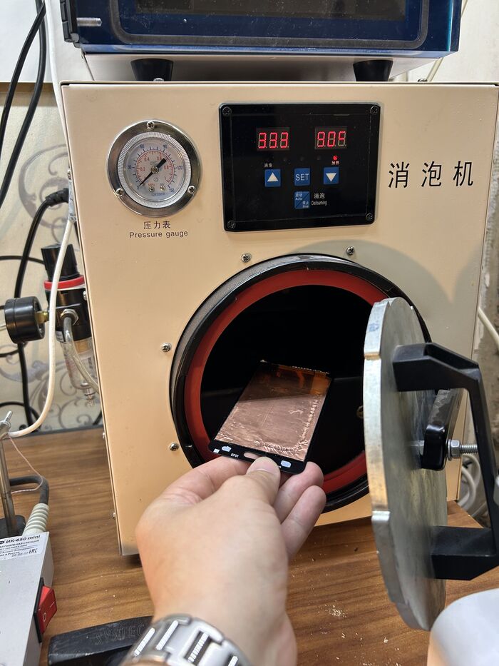 Во время установки нового стекла практически неизбежно между стеклом и дисплеем образуются пузырьки воздуха, которые мы конечно же вежливо попросим уйти.