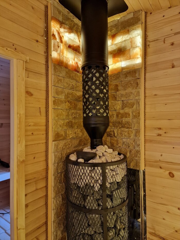 обложил печь поверх минерита плиткой из натурального камня и плиткой из соли (как позже оказалось, идея с солью была неудачной, но об этом в других постах)