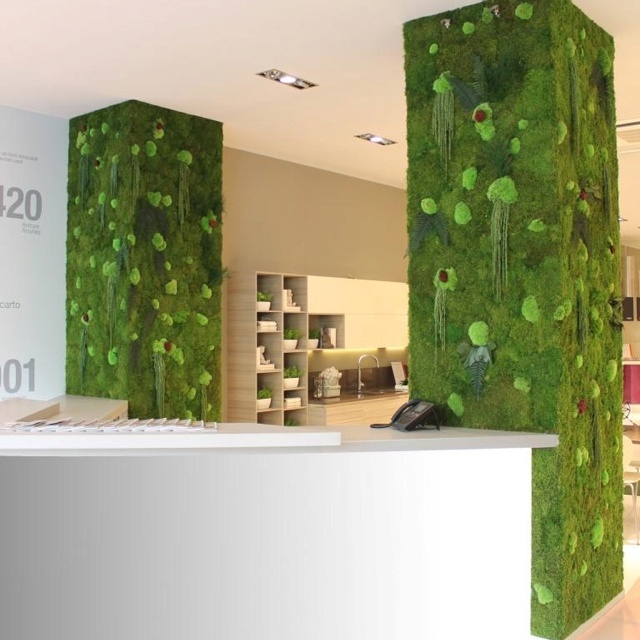 В таких местах мох производит сильное первое впечатление — он всегда вызывает живую реакцию, потому что смотрится неожиданно, свежо и стильно. Особенно если он оформлен в виде целой декоративной стены, или логотипа.