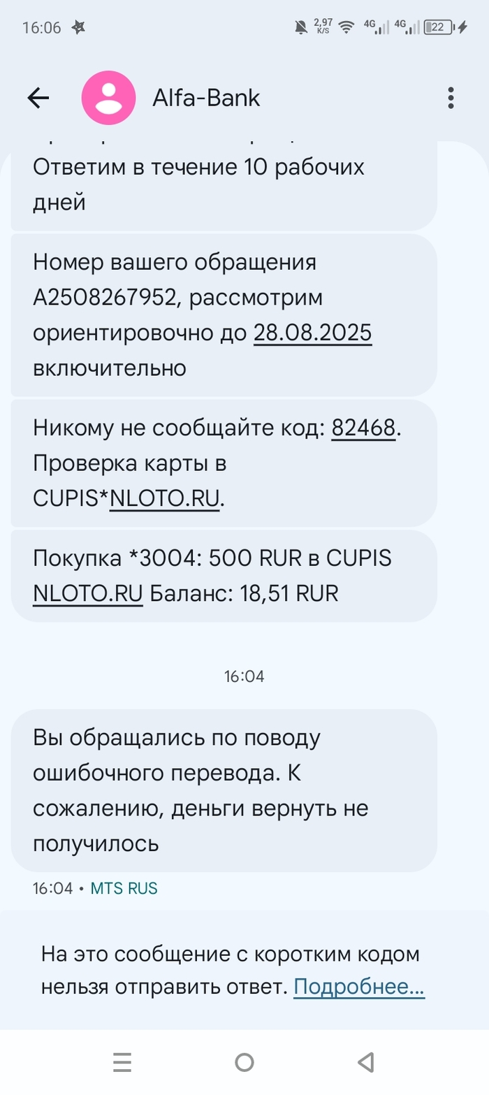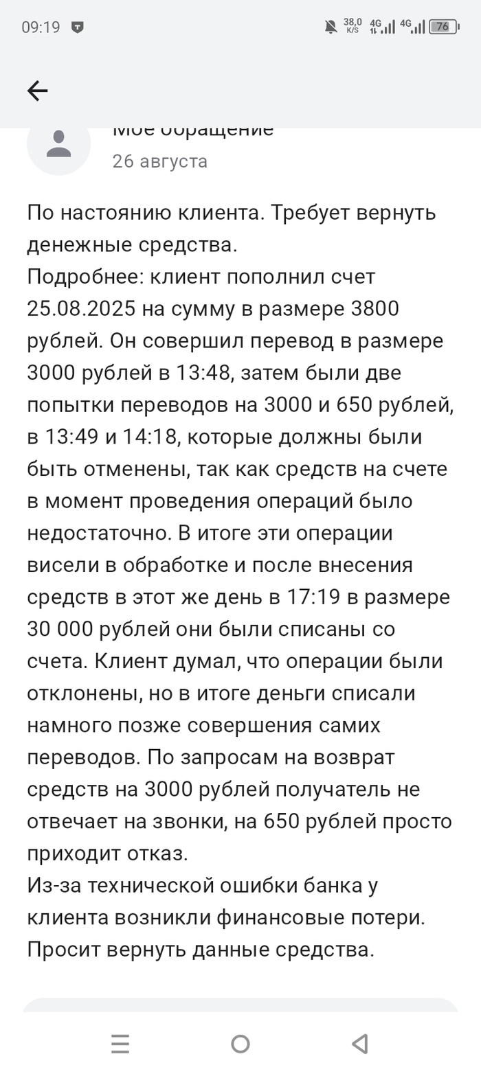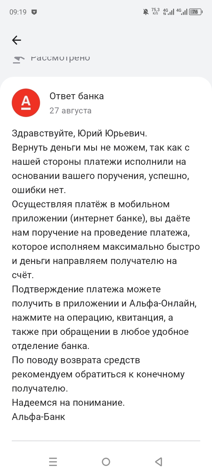Самый конченный банк!!! Во первых нет решения проблемы !!! Во вторых они соглашаются с тем что виноваты ну все действия возлагают на самих клиентов для решения проблем !!!(НА БАЛАНСЕ НЕ БЫЛО СРЕДСТВ ДЛЯ СОЗДАНИЯ ПЕРЕВОДА ЧТОБЫ ЭТОТ ПЕРЕВОД БЫЛ В ОБРАБОТКЕ , ТАКОГО ПОНЯТИЯ НЕТ СОЗДАТЬ ПЕРЕВОД А ДЕНЬГИ ВНЕСТИ ЧЕРЕЗ 3 ЧАСА!!!25 августа делал 4 перевода в 13:50 и 14:20 как выяснилось позже изо тех проблем банка автоматом !!! Денег на счёте не было ну они взяли в обработку эти переводы и уже после 17: 50 я пополнел карту на 30000 и что вы думаете эти переводы которые должны были отмениться которые не прошли в указанное время они сняли в 17:50 и денежные средства ушли без возвратно на что мне пишут !!!!! Чтобы я решал проблему сам!!! Самое удивительное что все они отрицают причастность тех сбоев и переводы якобы делались с согласия; да с согласия ну в указанное время деньги не списывались и не было их на счете так как программа зависла !!! Ну мои доводы их не устраивают думаю судиться сумма маленькая ну нервов потрепали избыток !! Переводил клиентам альфа банка и они не смогли связаться с клиентами их же банка. Получается в банке столько же мошенников сколько и сам банк раз они со своими рычагами давления не могут повлиять на возврат ошибочных по их вине подчеркиваю (по вине банка так как был сбой и они это все однозначно признали )значит карты выдают кому хотят и когда хотят!!! Интересно конечно в других банках перевод не может быть осуществлен с минусом ну не в альфа банке !!! Переводите деньги и пострадаете все те кто читает это хочу собрать вас для подачи в суд на этот бан кто пострадал 25 августа 2025 года с 12:00 по 00: 00 отзовитесь
