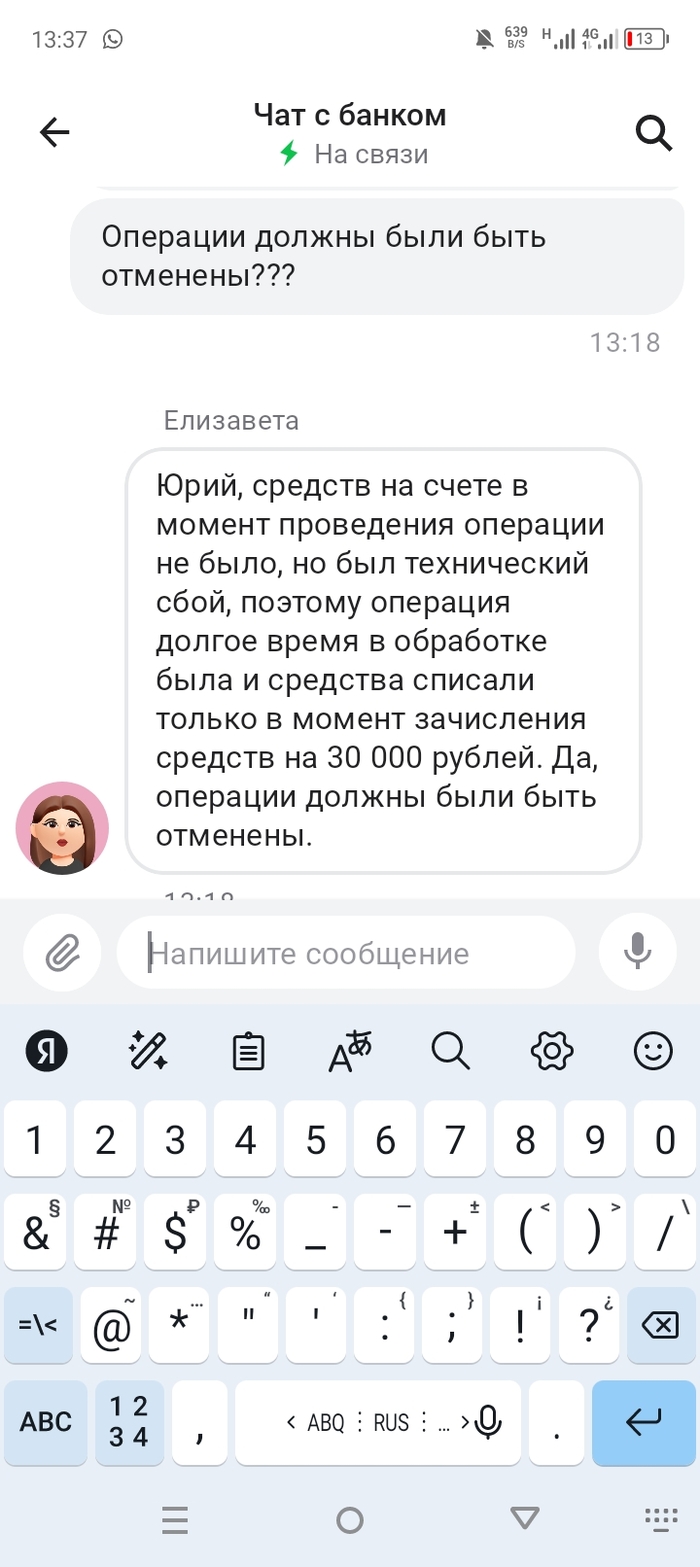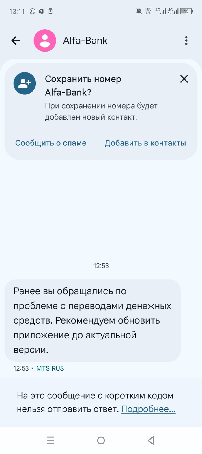 Ответ просто обновите и все !!! Ну мало этого я переводил клиентам альфа банка !!!! Ответы операторов опять убили
