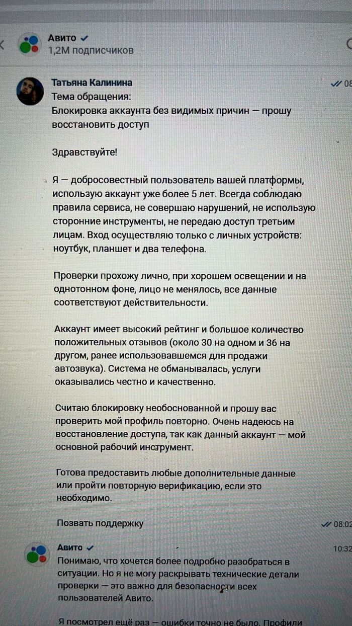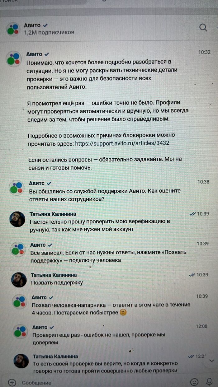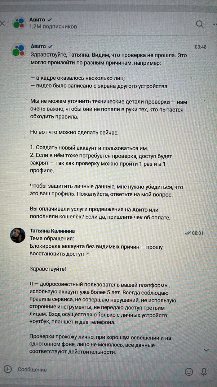 Интересный момент в чате ранее «Мне написали, что восстановить доступ невозможно, а вместо этого нужно сделать новый профиль. Но зачем, если он будет существовать ровно до первой проверки и сразу окажется заблокированным?» А буквально через день пишут пройдите верификацию и получите доступ к профилю. Где вообще присутствует логика во всех этих сообщениях от службы поддержки авито, когда вначале говорят одно, а потом резко меняются в показаниях и пишут совершенно противоположные сообщения.