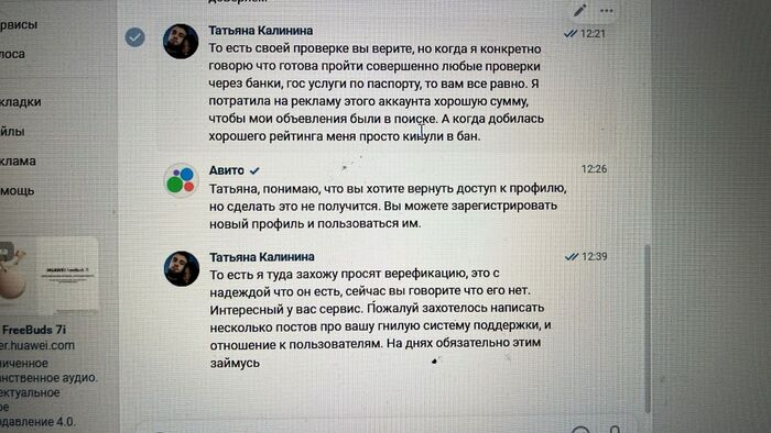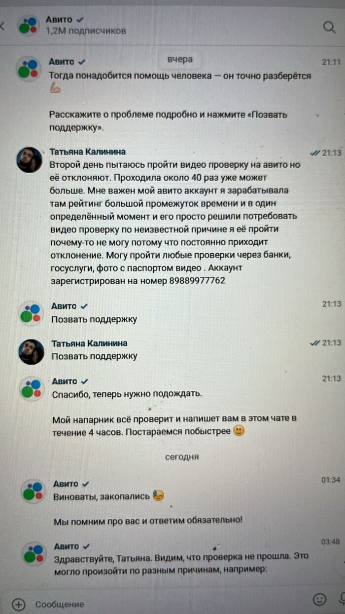 Ночью ещё и пришло сообщение от службы поддержки Авито во ВКонтакте. Спросили, обращалась ли я в поддержку и по каким вопросам. Я подробно расписала даты и причины. В ответ услышала лишь: Спасибо, все совпало. Уточню информацию и вернусь с ответом.. Уже 15 часов как жду.