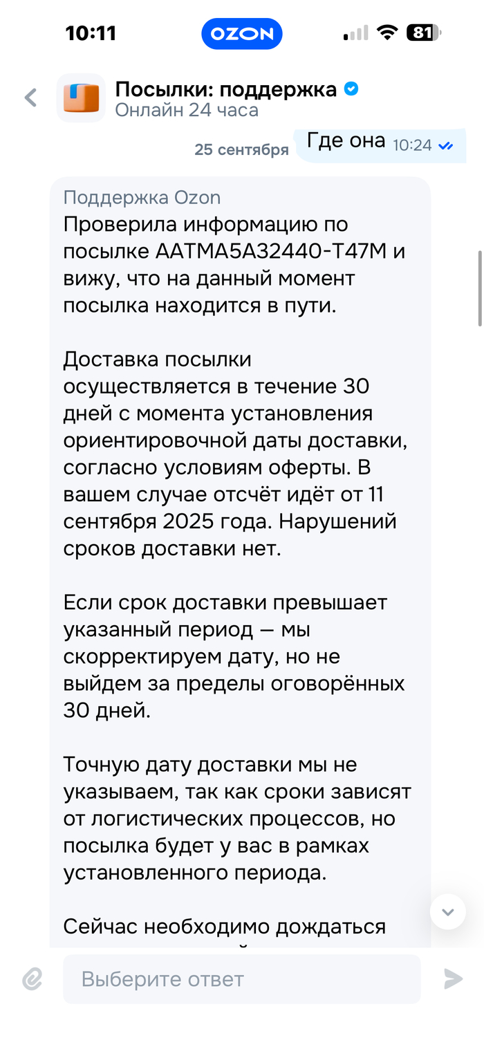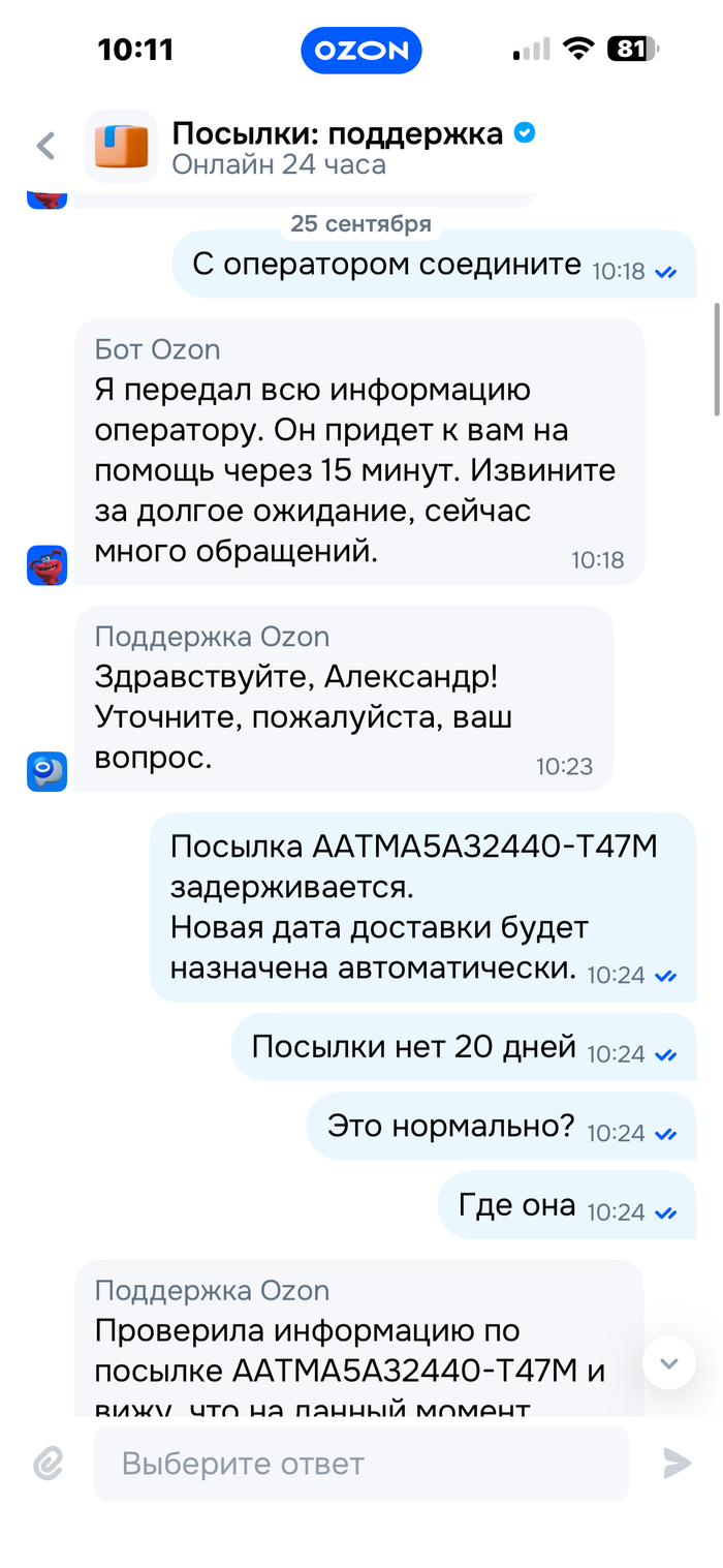 Проясните что у вас с доставкой творится ??? У вас одна и та же логистика….НО - доставка посылки с Питера до Самары идет уже больше месяца Карл…как так то??? В поддержке шаблонные ответы, в ПВЗ ссылаются на поддержку которая отвечает одно и то же…Вам не кажется что это похоже на бред??? Найдите мою посылку!!!!