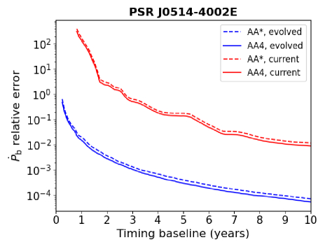 Моделирование эволюции пульсаров PSR J0737−3039A и PSR J0514−4002E показывает, что конфигурация SKA AA4 обеспечивает снижение неопределенности измерения производной периода обращения примерно на 60% по сравнению с конфигурацией SKA AA∗, что соответствует современным наблюдательным данным.