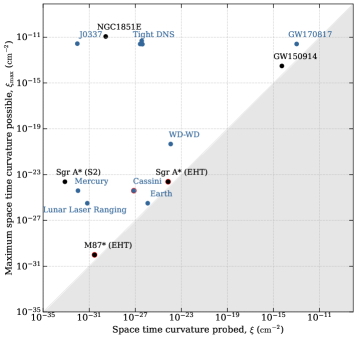 Сравнение различных гравитационных экспериментов показывает, что максимальная кривизна пространства-времени ограничена и определяется как корень квадратный из скаляра Кречмана, полного сокращения тензора Римана, при этом недостижимые области на графике выделены серым цветом, а эксперименты, проводимые на околоземной орбите (например, Gravity Probe B), представлены наряду с другими методами.