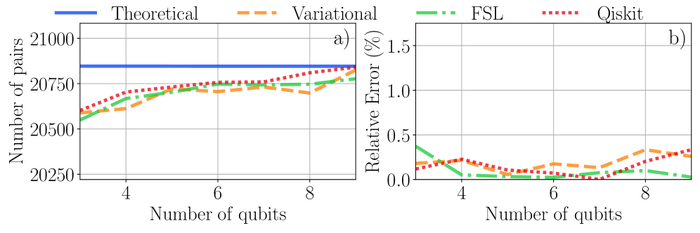Сравнение различных методов начальной инициализации вариационного алгоритма показывает, что использование вариационного подхода (оранжевый), загрузчика Фурье (зеленый) и метода Qiskit (красный) обеспечивает сходимость к теоретически предсказанному числу пар (синий), при этом относительная ошибка уменьшается с увеличением числа кубитов.