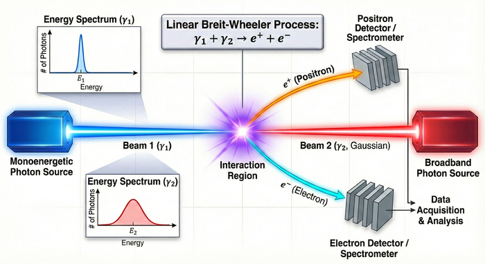 Столкновение двух лучей, запечатленное на схеме, демонстрирует рождение электронно-позитронных пар посредством линейного процесса Брайта-Уиллера, раскрывая фундаментальный механизм превращения энергии в материю.