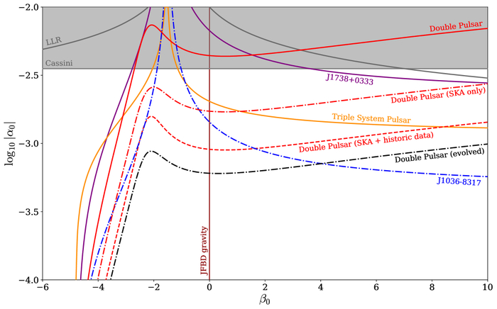 Исследование накладывает ограничения на параметры теории гравитации Дамура-Эспозито-Фарезе, используя наблюдения за двойными пульсарами, демонстрируя, что с точностью, достигаемой благодаря данным, собранным в течение 16 лет, а также с потенциальным улучшением, которое может быть достигнуто с помощью радиотелескопа SKA-mid AA4 в течение 10 лет, эта теория приближается к общей теории относительности, при этом особый вклад вносит анализ эволюционировавшей двойной системы с орбитальным периодом около часа и данные о пульсаре J1036−8317, дополненные оптическими наблюдениями его компаньона.