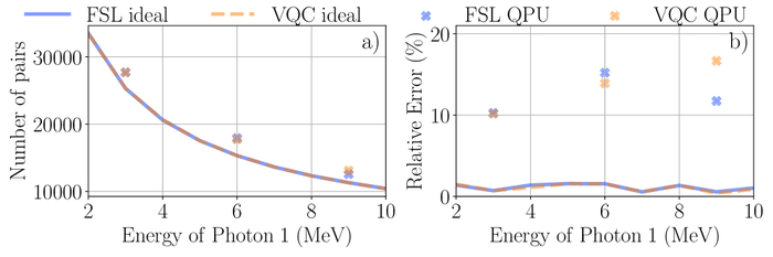 Сравнение методов начальной инициализации состояний с использованием вариационного подхода (пунктир оранжевого цвета), загрузчика ряда Фурье (FSL, сплошная синяя линия) и симуляций на квантовом компьютере показало, что относительная ошибка зависит от выбранного метода, при энергии моноэнергетического пучка от 22 до 10 МэВ.