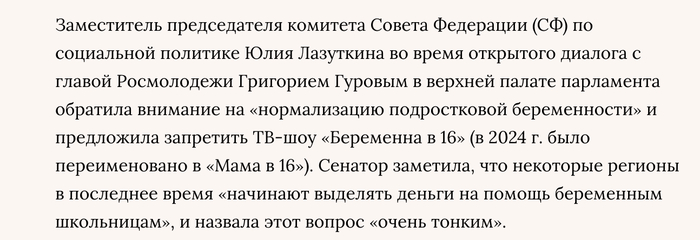 Последние несколько лет тема подростковой беременности в России перестала быть исключительно социальной проблемой — она все чаще звучит в медиа и политической повестке. Государство говорит о поддержке несовершеннолетних матерей, регионы вводят выплаты школьницам и студенткам, а на телевидении продолжают выходить проекты, посвященные раннему материнству. Один из самых заметных — шоу «Мама в 16», ранее известное как «Беременна в 16».