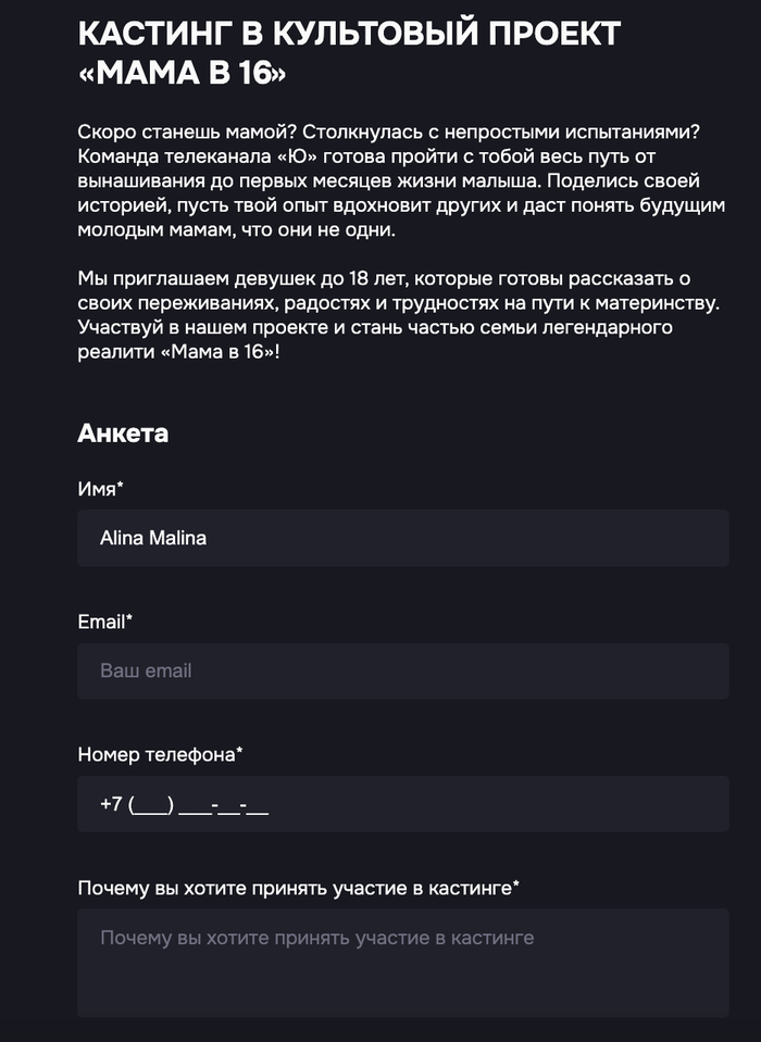 Чтобы попасть в проект, девушка должна пройти кастинг — заполнить анкету на официальном сайте телеканала или быть найденной редакторами в социальных сетях. По словам бывших участниц, продюсеры активно мониторят тематические группы во «ВКонтакте», где легко отследить беременных подростков и оценить их социальное окружение. На кастинговых сайтах обещают гонорар от 30 тысяч рублей, но точная сумма заранее не называется.