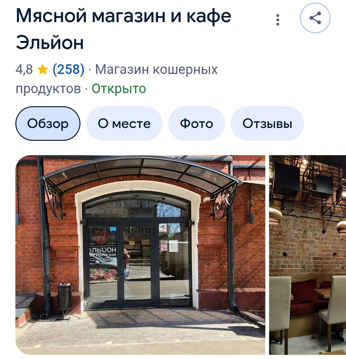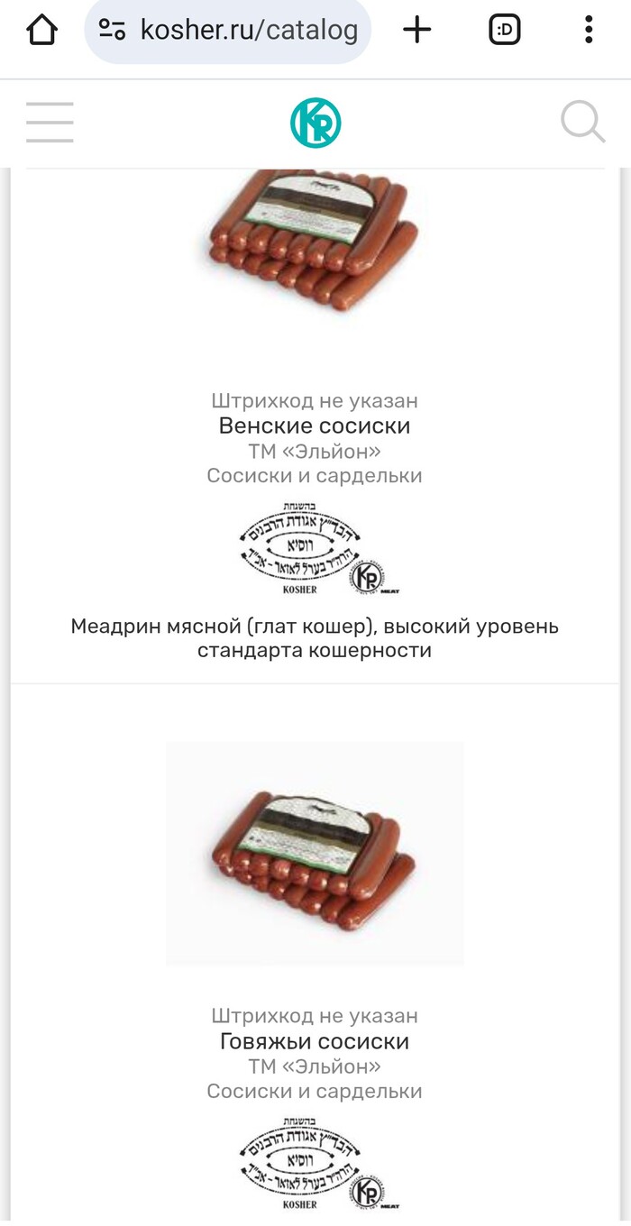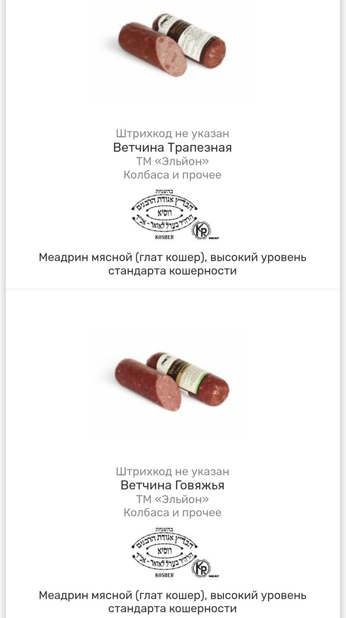 Во-первых, кошерное мясо. В посте делается упор на то, что кошерное мясо требует особого ритуального забоя и из-за этого его производство усложняется. Это абсолютно верно. Но если перейти на сайт kosher.ru в каталог мясных продуктов, мы увидим, что он на 96% состоит из мясной продукции некой ТМ «Эльйон». Название необычное, согласитесь? А всё потому, что это тот самый специализированный религиозный магазин! Точнее, мясной магазин кошерных продуктов и кошерное кафе. Едва ли какая-нибудь Пятёрочка или Спар станет закупать такую узкопрофильную продукцию.