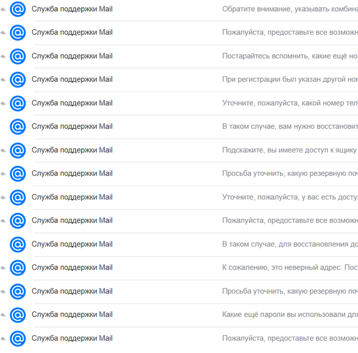 Проблемы в тут две: 1. В конце или середине(не важно) этих резервных почт вы в любом случае столкнетесь с трудностями где у вас не будет информации или доступа к нужным для восстановления номера. 2. Они не берут во внимание информацию о почте кроме наличия привязанного номера и резервной почты, вообще никакую. Они спрашивают варианты паролей, пароли, рассылки, адреса, номера, но это не берется во внимание, они работают по шаблону, а шаблон такой - Должен быть актуальный номер телефона с доступом к нему и резервная почта с доступом. Я десятки раз им предоставлял всю информацию о ящиках, и предоставлял информацию о которой мог знать только владелец то есть я, например откуда были все входы в почту, на какие я адреса писал, какие именно сервисы привязаны к ящику - но для них это ничего.