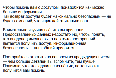 Всего этого поддержка посчитала недостаточным, и для восстановления нужно получить доступ к резервной почте. К рез. почте у меня так же есть адрес почты, действующий пароль, номер телефона(Но без доступа к нему т.к это мой старый номер), рассылки, сообщения, варианты старых паролей, адрес резервной почты, но так же без доступа.