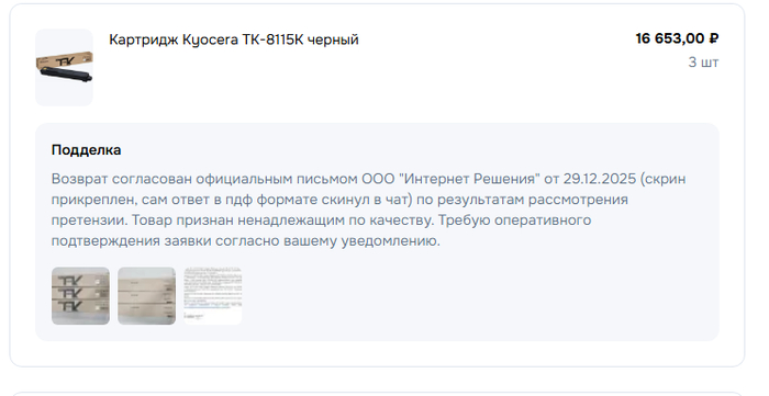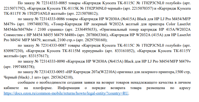 Я — менеджер по претензиям ООО «Альфа Трейдинг». В декабре 2025 года мы закупили на Ozon партию картриджей HP и Kyocera на 700 000 рублей. То, что мы получили — это не «параллельный импорт», это откровенный хлам с фишинговыми ссылками