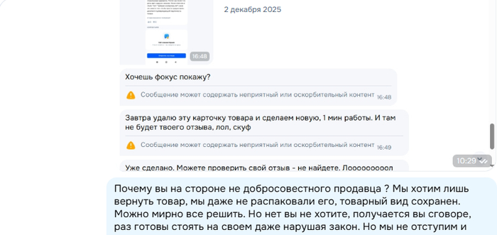 А дальше самое интересное. Я написал честный отзыв чтобы предупредить остальных пользавателей. Смотрите что делает этот продавец: