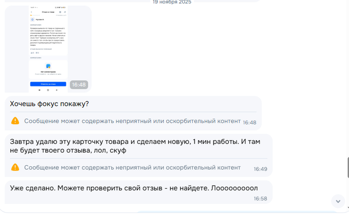 Ведь никаких действий против этого селлера не было принято после предоставления доказательва им в чат.