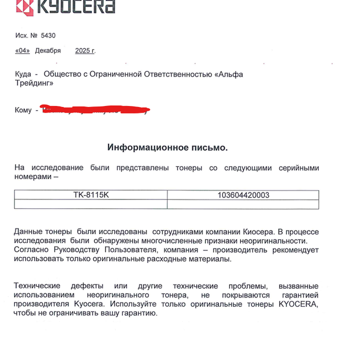 Но в итоге мы оказались правы по картриджам Киосера, правообладетль признал контрафакт экспертизой
