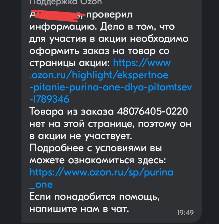 В общем решил купить своему коту сухой корм, на на небезызвестном маркетплейсе @Ozon, никогда до этого не покупали, решающим шагом стало участие в розыгрыше автомобиля. Ну чё купил - получил. А где талон, там или номер участника лотереи??, а хер тебе! - ответили мне в поддержке... Ты заказал в озоне, но не по той ссылке...и якобы не тот товар.