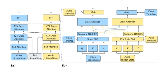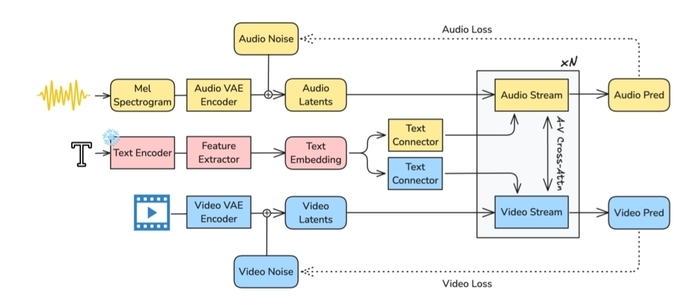 Её архитектура представляет собой асимметричный двунаправленный трансформер с отдельными потоками для видео (14B параметров) и аудио (5B параметров), связанными сквозным кросс-вниманием. Для создания применялось сквозное обучение, во время которого модель обучается совместно на видео и аудио, что обеспечивает лучшую синхронизацию (например, движение губ и речь), чем раздельные модели.