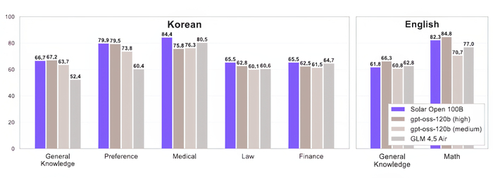 В результате модель демонстрирует сильные результаты в корейских тестах (общие знания, финансы, право, медицина), превосходя или соответствуя аналогам, при этом сохраняя конкурентоспособную производительность на английском.
