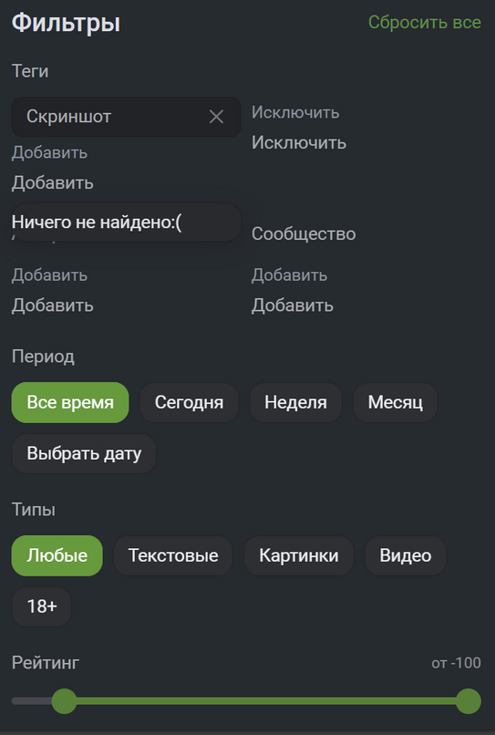 Поиск с фильтрами стал в принципе невозможен. На всё пишет "Ничего не найдено". Проверял с разных устройств и с разных аккаунтов, везде одно и то же. Не важно, что ты пишешь, оно выходит просто всегда.