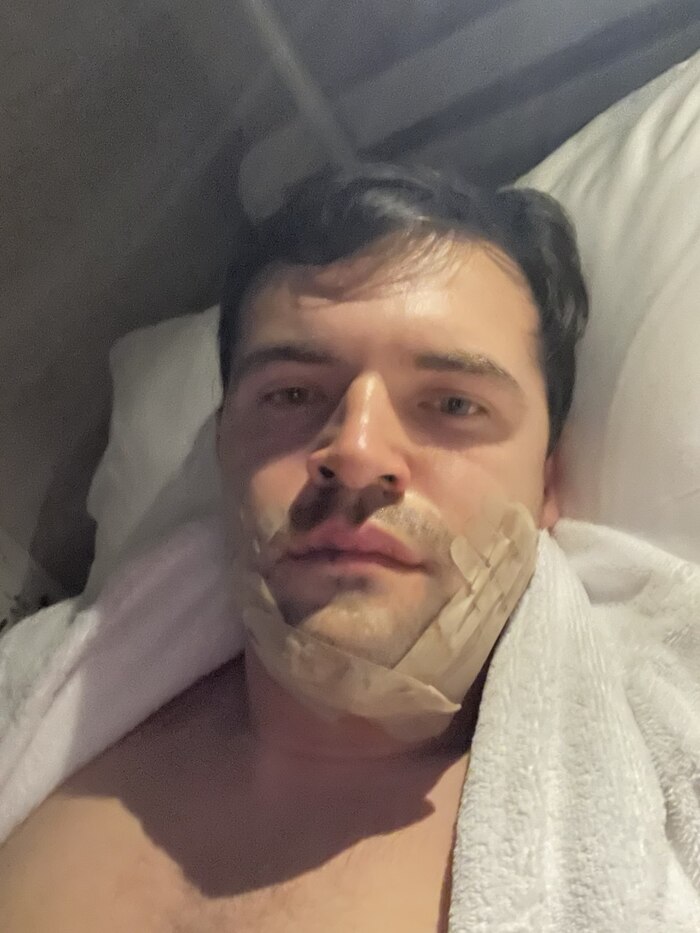 Первые три недели — самый ад. Лицо не узнать, отёк не спадалдаже ночью. Казалось, кожа просто натянута до предела. Губы и подбородок не чувствовал совсем. Нос был заложен постоянно, говорить особо не мог, питался через шприц.
