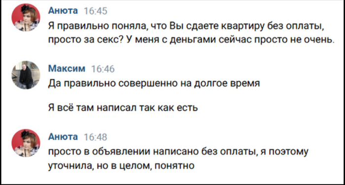 А мне интересно стало, думаю: чо такое? Неужто кто-то так хочет трахаться отчаялся, что готов за возможность присунуть пиписку цельной квартирой в культурной столице разбрасываться? И вообще: что за падение нравов?