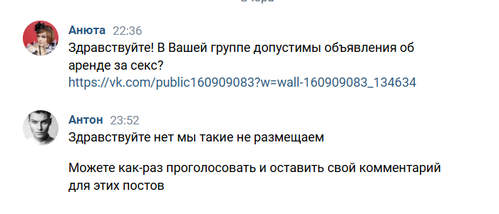Написала админу группы в личку. Так мол и так, как посмели допустить такие непотребства. Админ пишет: салам-пополам, никакого секса. Такие объявления мы не размещаем.