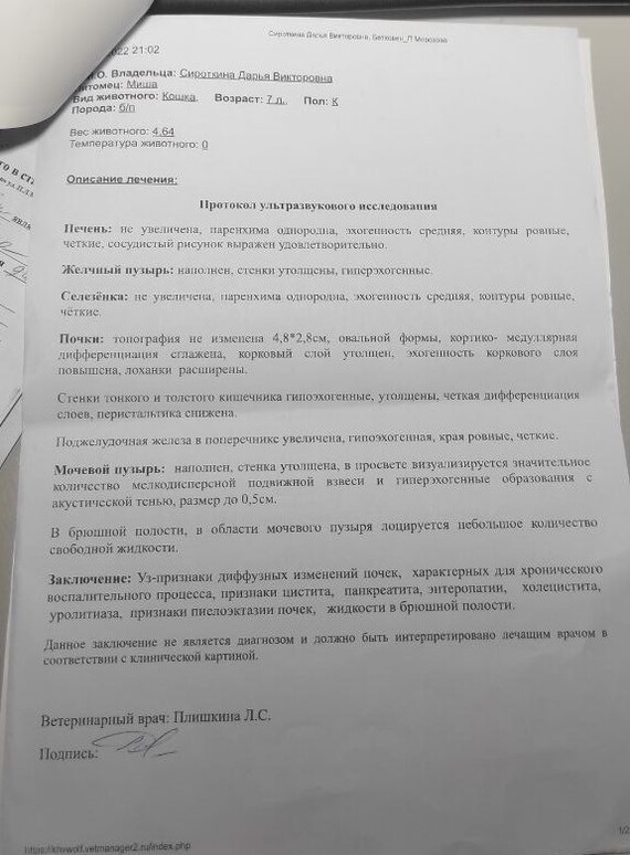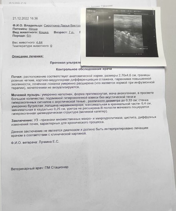 Случилась острая задержка мочи, поставили катетер (кололи цефтриаксон, глюкозу, витамины, этамзилат, папаверин, поили мореной красильной, все 6 дней кот не какал, не ел, пил насильно), после снятия кот не смог писить, через 3 дня случилась снова острая задержка мочи, состояние ухудшилось, стал блювать белой, а потом желтой пеной, отказ от еды и воды, дальше отвезла в другую клинику, поставили еще раз катетер, 2 дня кот был в стационаре из-за ужасного состояния, провели анализы, сделали узи. Врач порекомендовал уретростомию и цистостомию ( врач сказал что в мочевом камни и песок, но узи этого не показало, сделали рентген, никаких камней). Когда сняли катетер ( проколола ему хлорид натрия, синолокс, давала корнам), кот стал потихоньку писить сам, кушает (уринари про план), какает, прошло 2 недели, кот стал писить еще лучше. Единственное что смущает так это то что на узи плоховаты почки, как их лечить врач особо не указал, хотя на узи расписан диагноз и анализы не очень. Если есть компетентный человек, то хотелось бы услышать мнение, что дальше делать с почками ( кот чувствует себя хорошо, ест, пьет, писает, какает, играет). Но изначально второй раз когда ставили катетер коту поставили ОПН на фоне ОЗМ.