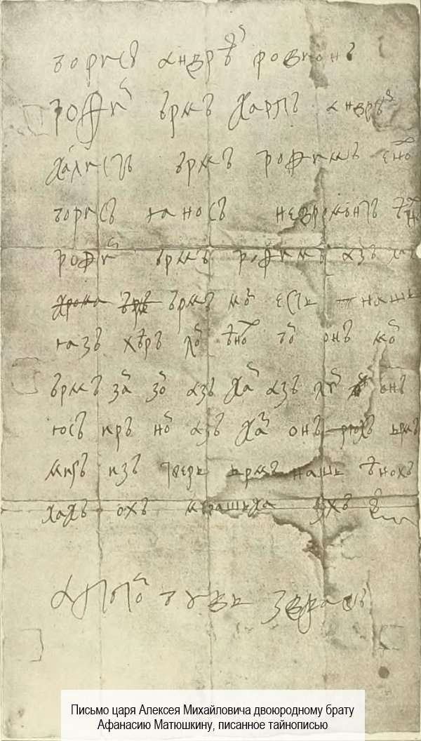 И еще… Рассказ был бы не полным, если бы мы не упомянули про шифры, используемые в деятельности Приказа тайных дел. Подьячие в своей деятельности широко использовали шифры. Причем ключи к шифровке не записывались, а заучивались наизусть. Существовали различные виды шифрования. Обычно их составляли по принципу подмены одной буквы другой. К примеру, пишем букву «а», а читаем – «я» и т. д. Подобный способ шифрования назывался «литореей» («буквенный» от лат. «litera»-«буква»), ну, или, как его тогда называли, «тарабарской грамотой». А зашифрованное письмо называли «затейным». Видите, как красиво!