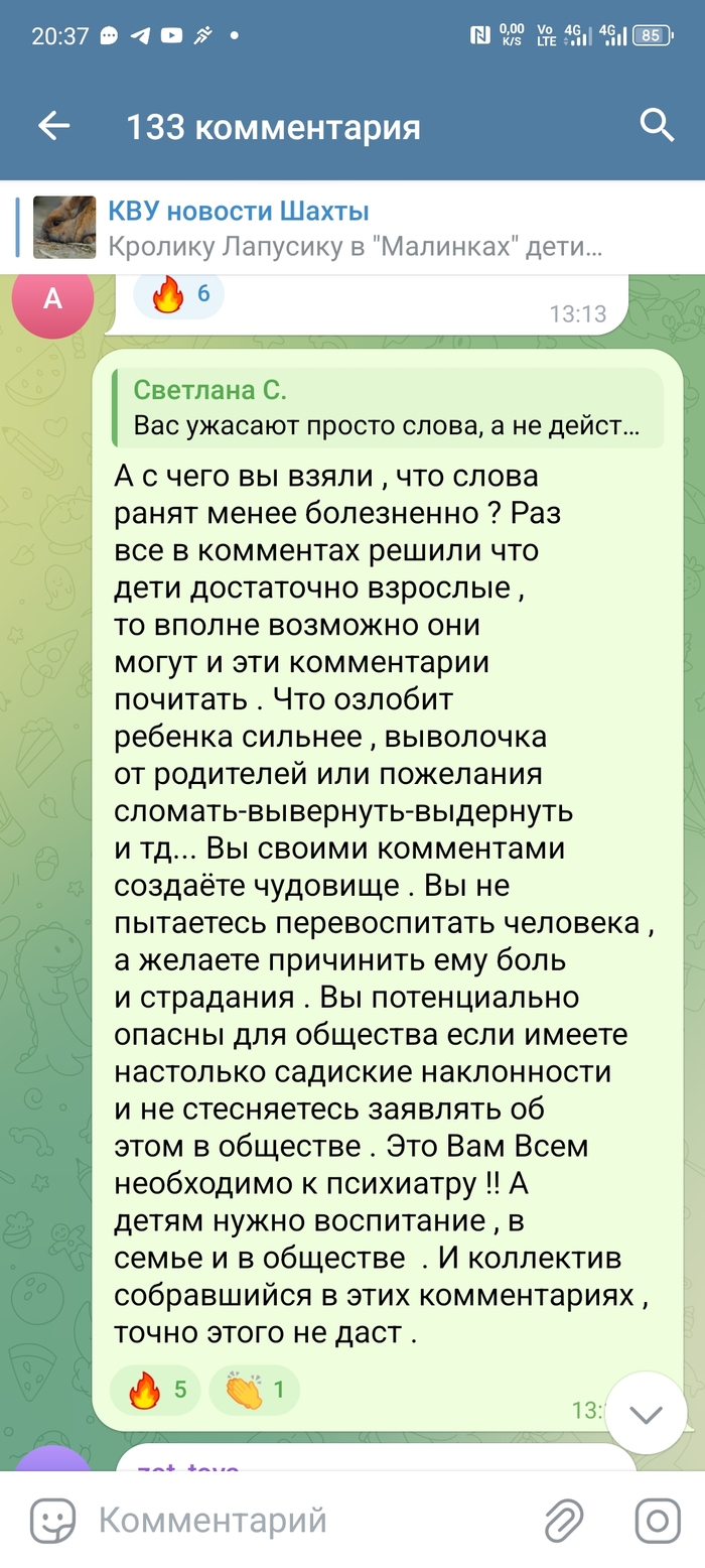 Скрины моих комментариев и комментариев оппонентов , более подробно , при желании, можно почитать в самом чате . https://t.me/shahtyKVU