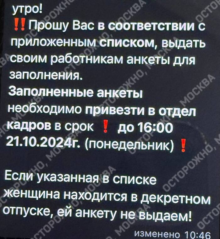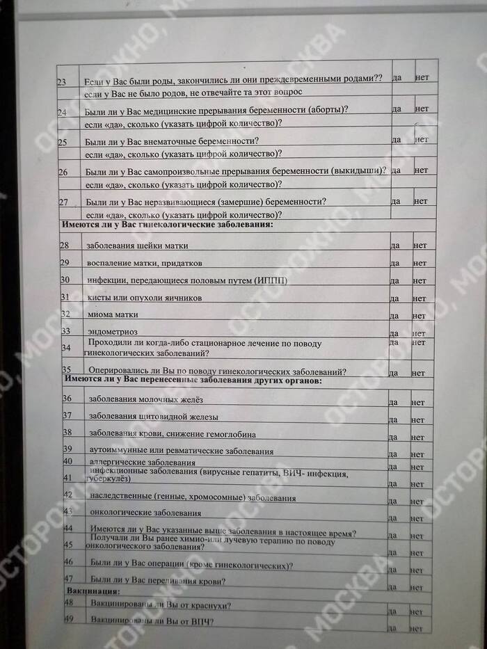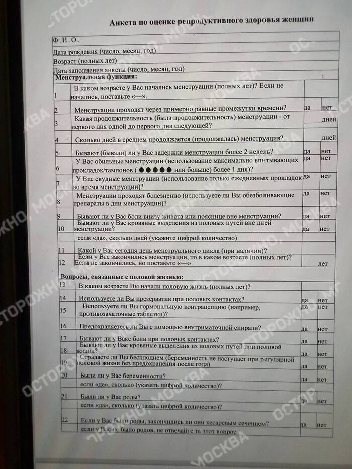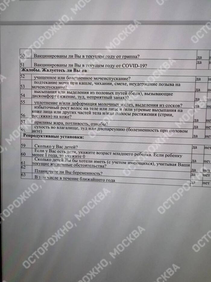 «Осторожно, Москва» пишет, что не все сотрудницы стали заполнять анкету, решив поставить в опроснике прочерки. Со слов женщин, теперь их хотят обязать «встретиться с врачами лично и ответить на эти же вопросы добровольно принудительно»