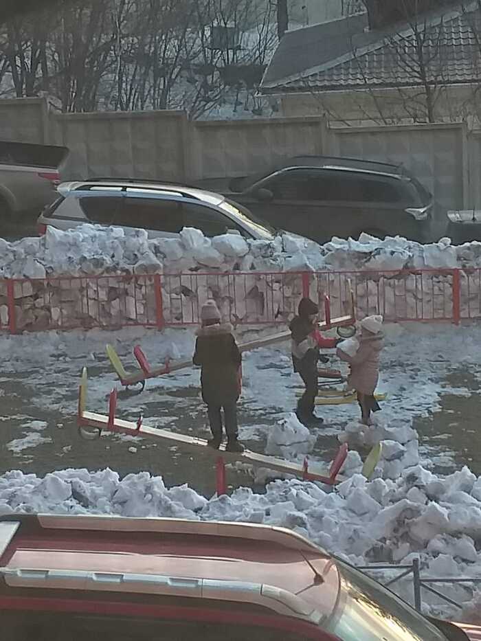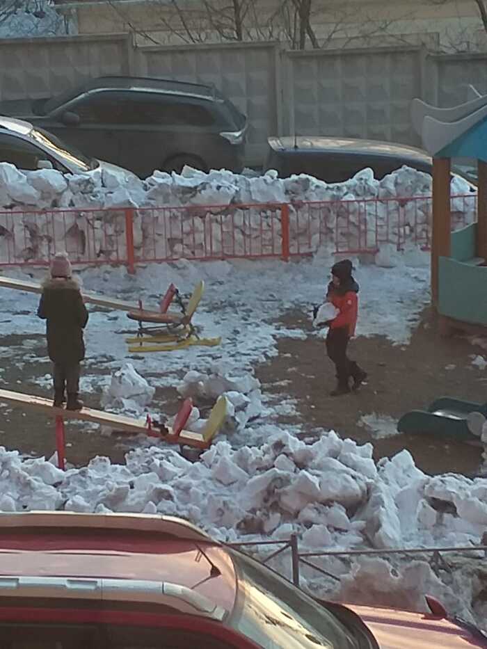 Зачем дебилы заставили дворника снег долбить с детской площадки?