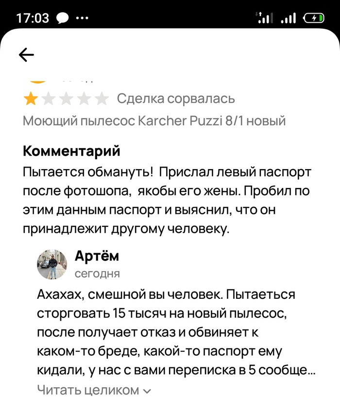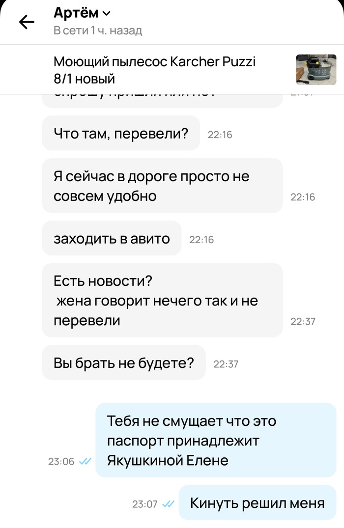 Также несколько раз написал обращение в службу поддержки Авито, чтобы заблочили этого кидалу, но они не реагируют...