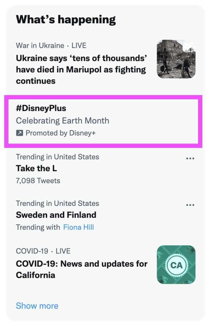 Twitter предлагает продвигаемые тренды (также известные как поглощение тренда) как способ для бизнеса охватить большую группу потенциальных клиентов. Продвигаемые тренды отображаются вверху списка актуальных тем в Twitter, и они четко помечены как продвигаемые. Когда пользователь нажимает на продвигаемый тренд, он увидит твиты как от компаний, так и от обычных пользователей, которые связаны с этим трендом. Продвигаемые тренды - это эффективный способ охватить большую аудиторию в Twitter, и они могут помочь повысить узнаваемость бренда и привлечь новых потенциальных клиентов.