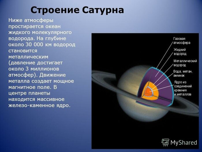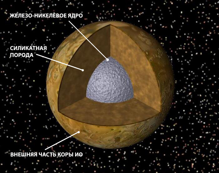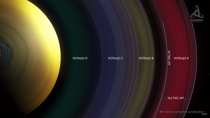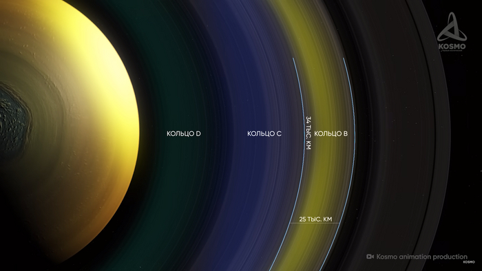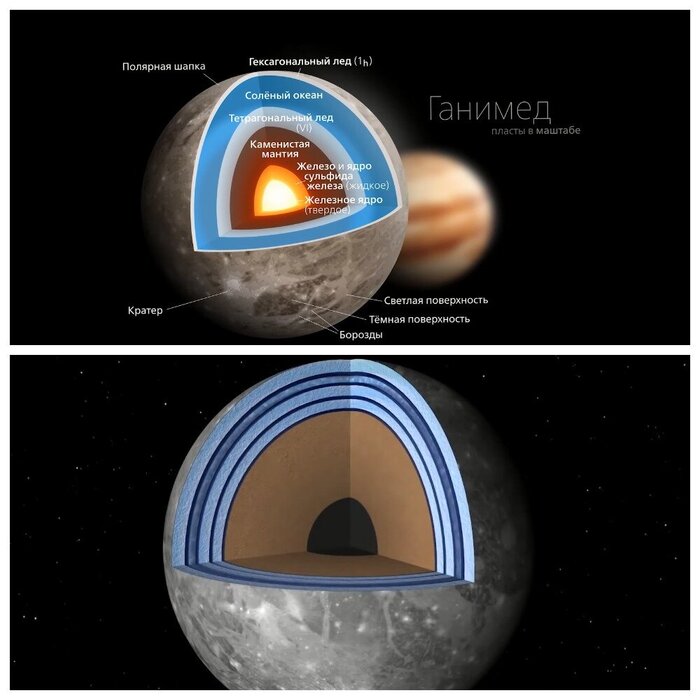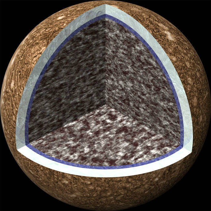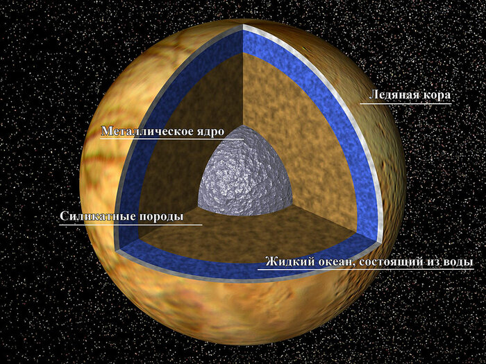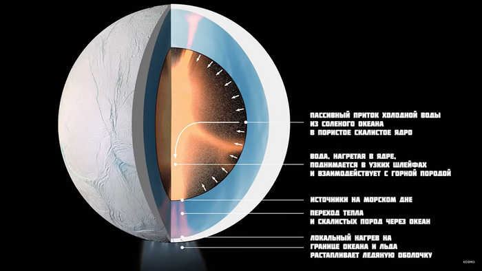 Внутреннее строение Энцелада: разогретое ядро, подледный океан и ледяная кора. Кадр с канала KOSMO.