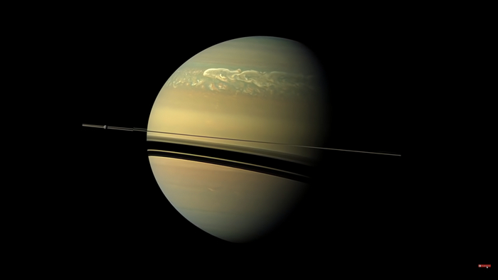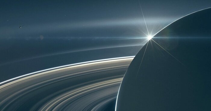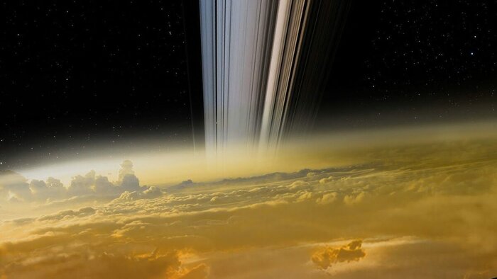Предположительно, таким мы бы увидели Сатурн с Энцелада. Всё равно очень красиво, хоть и кольца видимы лишь с ребра. Картинка из открытых источников.