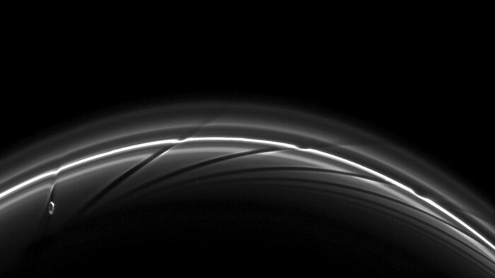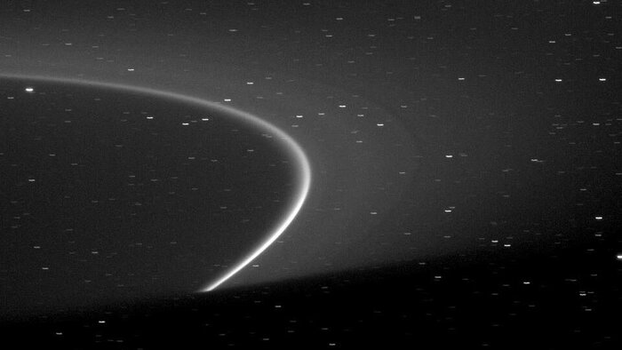 Есть очень интересный снимок Тефии, сделанный зондом «Кассини», на котором она кажется нанизанной на узкое кольцо F: