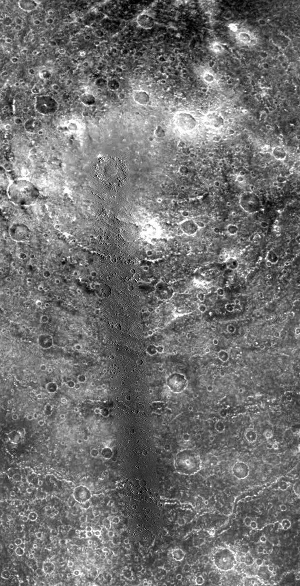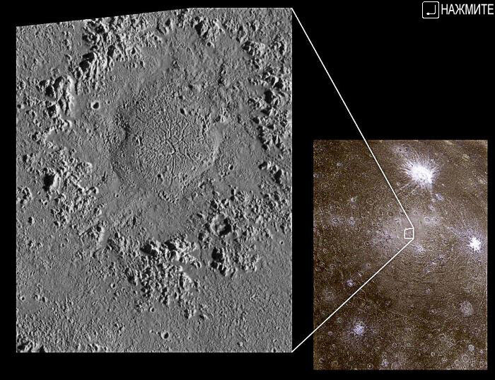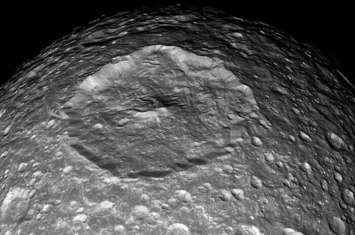 Стены кратера в выcoту достигают 5 км, глубина воронки – 10 км, а пик в центре возвышается на 6 км. На такой маленькой луне кратер выглядит весьма внушительно: если пропорционально представить его на Земле, он охватил бы пространство в 4000 км, то есть раскинулся бы примерно от Москвы до Усть-Кута (в Иркутской области)!