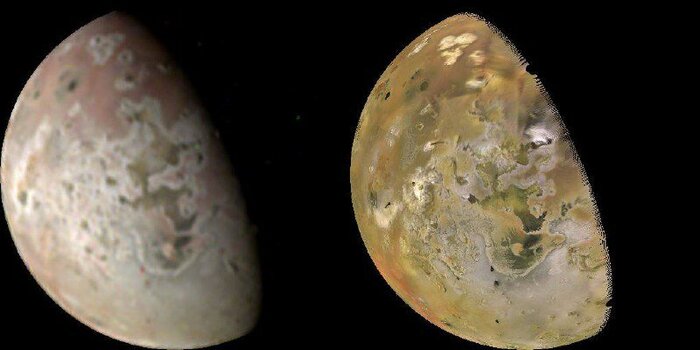 Фото Реи в ложных цветах - для представления о разнице между темным и светлым участками поверхности. Источник: NASA.