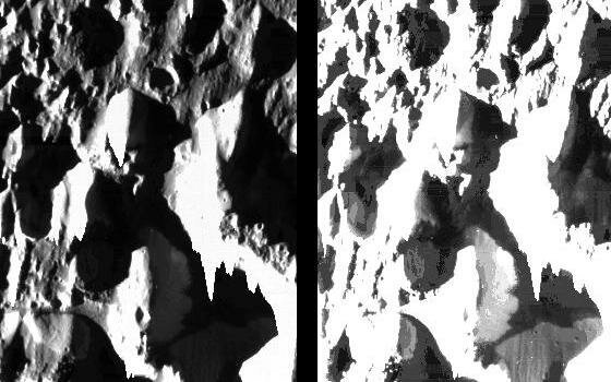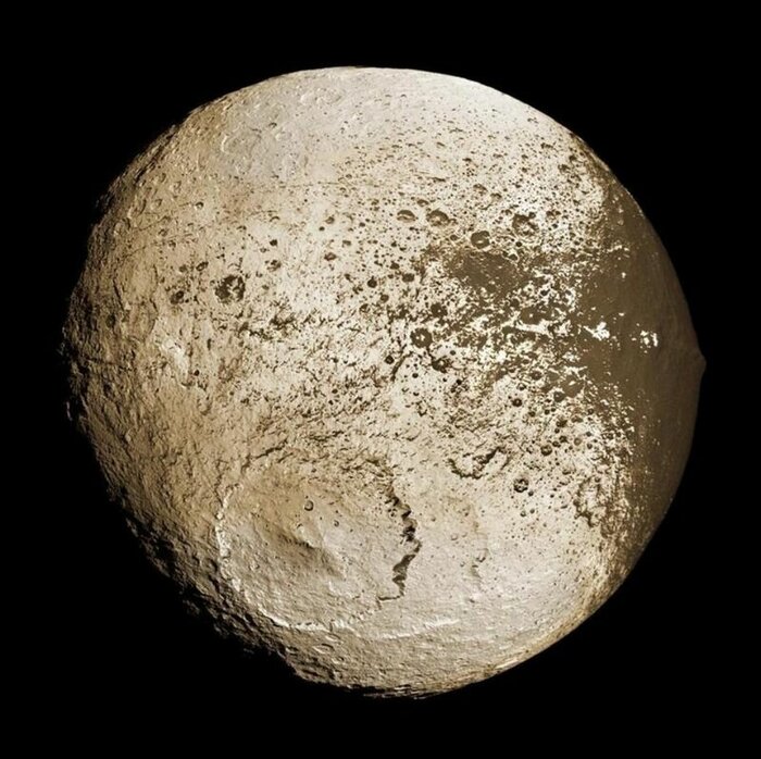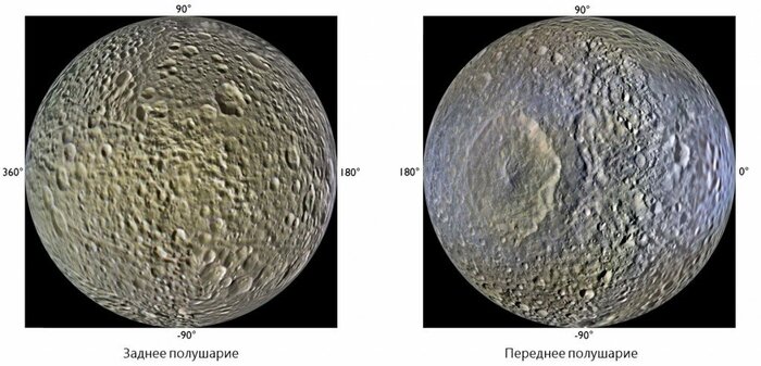Полушарие, обращенное к Сатурну – светлое и в кратерах, а заднее – темное и более гладкое: