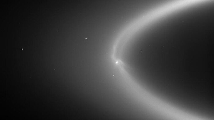 За время своего пребывания на орбите Сатурна «Кассини» 39 раз сближался с Энцеладом, и стало ясно, что гейзеры на спутнике – явление постоянное. Именно они создают этому маленькому небесному телу, обладающему, конечно же, очень низкой гравитацией – атмосферу, хоть и разряженную, но по сравнению с другими спутниками – плотную. Более того, гейзеры Энцелада «питают» своими извержениями сатурнианское кольцо Е, не давая ему распылиться в космосе.